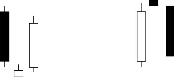 ③早晨之星和黄昏之星(见图10.11)。一根实体较长的阴线之后紧接着出现一根跳低开盘的小阳线,第三天又出现一根阳线,且收盘价切入第一根阴线的上半部分。这种组合若出现在股价运行的底位,则是见底反转的信号。黄昏之星情况完全相反。