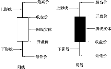 K线也称日本线,据说起源于200年前的日本。一条K线记录的是某一种股票一天的价格变动情况。将每天的K线按时间顺序排列在一起,就组成反映这只股票每天价格变动情况的K线图,这就叫日K线图。将每周、每月的K线按时间顺序排列起来,就是周、月K线图。价格的变动主要体现在4个价格上,即开盘价、最高价、最低价和收盘价。4个价格中,收盘价最为重要。K线是一条柱状的线条,由影线和实体组成。影线在实体上方的部分叫上影线,下方的部分叫下影线。实体分阴线和阳线两种,又称红(阳)线和黑(阴)线。图10.2是两种常见的K线形状。