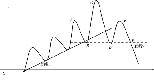在上升趋势中,不断升高的各个局部的高点和低点保持着上升趋势,然后在某一个地方趋势的上涨势头将放慢。图10.18中A和B点还没有放慢的迹象,但在C和D点已经有了势头受阻的信号,这说明这一轮上涨趋势可能已经出了问题。最后,股价走到了E和F点,这时反转向下的趋势已势不可挡。图10.18中的直线1和直线2是两条明显的支撑线。在D点突破直线1说明上升趋势的势头已经遇到了阻力,E点和F点之间的突破则是趋势的转向。另外,E点的反弹高度没有超过C点,F点的回落已经低于D点,这都是上升趋势出了问题的信号。