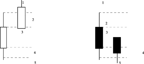 在K线组合中,两根K线的组合情况非常多,只要掌握了几种特定的组合形态然后举一反三,就可得知别的组合的含义。无论是两根K线还是多根K线,都是以两根K线的相对位置的高低和阴阳来推测行情的。将前两天的K线画出,然后,用数字将前天的K线划分成5个区域,见图10.8。前天的K线是判断行情的基础,第二天的K线是判断行情的关键。简单地说,第二天多空双方争斗的区域越高,越有利于上涨;越低,越有利于下降,也就是从区域1到区域5是多方力量减少、空方力量增加的过程。