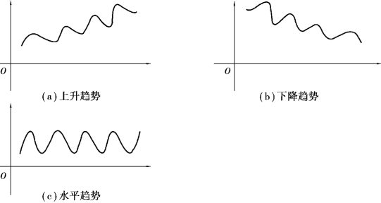 趋势就是股票价格的波动方向。趋势的方向有上升方向、下降方向和水平方向。如果图形中每个后面的峰和谷都高于前面的峰和谷,则趋势就是上升方向。如果图形中每个后面的峰和谷都低于前面的峰和谷,则趋势就是下降方向。如果图形中后面的峰和谷与前面的峰和谷相比,没有明显的高低之分,几乎呈水平延伸,这时的趋势就是水平方向。水平方向趋势是被大多数人忽视的一种方向,这种方向在市场上出现的机会是相当多的。图10.12是3种趋势方向的图形。