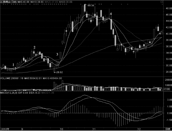 图10.28分别选取了5日、10日、20日和60日均线作分析参考,在对该股的分析中,主要从各均线之间的交叉情况和与股价的偏离情况两方面着手。图中在点1处,5日、10日和20日线互相扭在一起,并且60日线与股价的偏离程度相对较低,可知该股在这个时段正处于整理过程中,但很快地到了点2时,5日线从下分别上穿10日和20日线,10日线也同样上穿20日线,彼此形成金交叉,同时,股价处在均线之上并缓慢上升,这是股价上涨的信号。在点3处,成交量大幅增加,股价跳空高走,使四条均线彼此偏离度较大,尤其在股价达到最高点时,60日线大幅偏离股价,说明股价在强势拉升。但是由于均线与股价的较大偏离,也使这种上升趋势增加了回调的风险。如图中所示,当股价从高位回调至点4时,5日线从上下穿10日和20日线,10日线也下穿20日线,形成死叉,此时,股价大幅下压,回调至均线之下,这是股价下跌的信号,一般来说,见到这种较大的偏离和交叉情况,应该平仓出局。