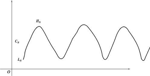 HN,LN——N日内的最高价和最低价。由公式可知,WMS%的参数是天数N,WMS%的参数习惯上取10或20。WMS%指标表示的含义是当日收盘价在N日内所处的相对位置。若CN=HN,则WMS%=100,表明收盘价格处在最高位置;若CN=LN,则WMS%=0,表明收盘价格处在最低位置;若CN=LN+(HN-LN)/2,则WMS%=50,表明收盘价格处在中间位置(见图10.26)。
