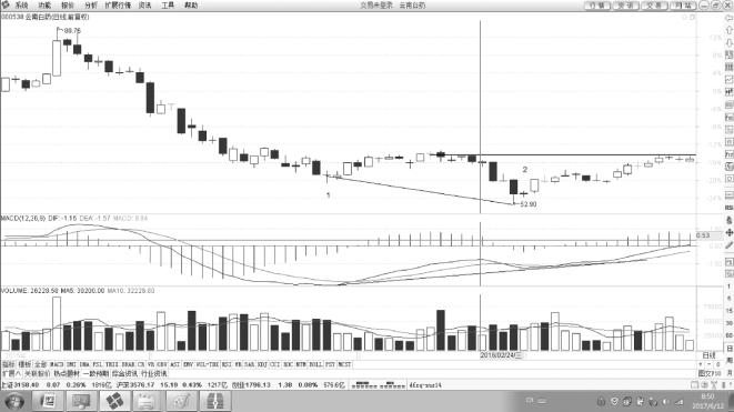 从图10.30可以看到,云南白药在2016年3月份走出了MACD的背离走势,之后在背离走势之前的波峰附近反复横盘震荡了大概3个月。后续股价脱离了震荡区,走出了一波长达一年的上涨行情,从62元附近涨到了93元,涨幅超过了50%。