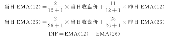 MACD由正负差(DIF)和异同平均数(DEA)两部分组成,DIF是核心,DEA是辅助。DIF是快速平滑移动平均数与慢速平滑移动平均数之差,快速是短期的EMA,慢速是长期的EMA。以最常用的参数12和26为例,DIF的计算过程是: