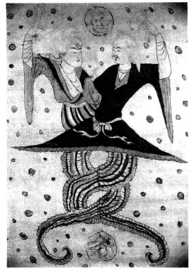 河南南阳出土的汉墓砖画中的伏羲、女娲形象,腰身以上是人形,穿袍戴冠,腰身以下则是蛇躯,尾端缠绕在一起;山东嘉祥出上的画像石中,伏羲、女蜗的形象亦同于南阳汉墓砖画,两人背向,伏羲在左,手执曲尺,女蜗在右,手执圆规,空中还有几位长着翅膀的人首蛇身的小人;新疆吐鲁番阿斯塔那出土的数十件伏羲、女蜗绢画,画面形式大致相似:人首蛇身,交尾相拥——国际权威机构研究,这乃生命基因DNA双螺旋结构,并且64卦与遗传密码相对应,不管你信还是不信,研究结果表明,这就是比卦爻还要玄妙的遗传基因密码。绢画上伏羲持矩,女蜗持规,画面上方有日,下方有月,周围布满北斗七星,甚至还有一颗流星——想起小时候老是担心,流星掉下来砸在谁的头上那可咋办?一颗流星划过夜空,仿佛一位远古神话人物骑一匹着了火的马,急急地奔向黑暗中的大地……伏羲所执矩象征地,女蜗所执规象征天,整幅画俨然一个日月星辰俱全的宇宙天地。