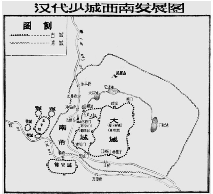 汉代成都城示意图。从图中可见,汉代成都大城外另筑“锦官城”“车官城”。“锦官城”位置大致在今南门大桥至百花潭之间(出自:《成都城坊古迹考》)