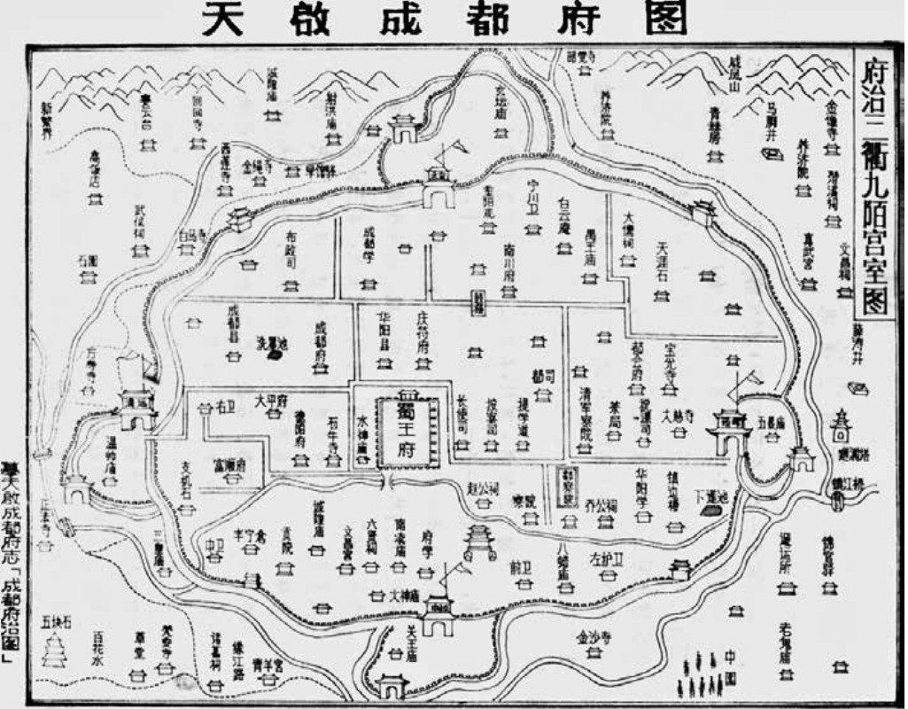 明朝《天启成都府图》(《府治三衢九陌宫室图》)。从这张1621~1627年绘制的地图上,可想见明末成都的繁华景象(出自:《成都城坊古迹考》)