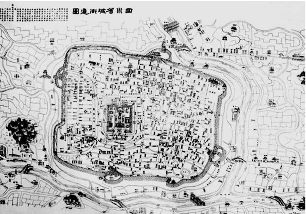 由成都“照相楼主人”吴绍伯于光绪二十年(1894)绘刊的清末《四川省城街道图》(出自:《城市规划与建设》)