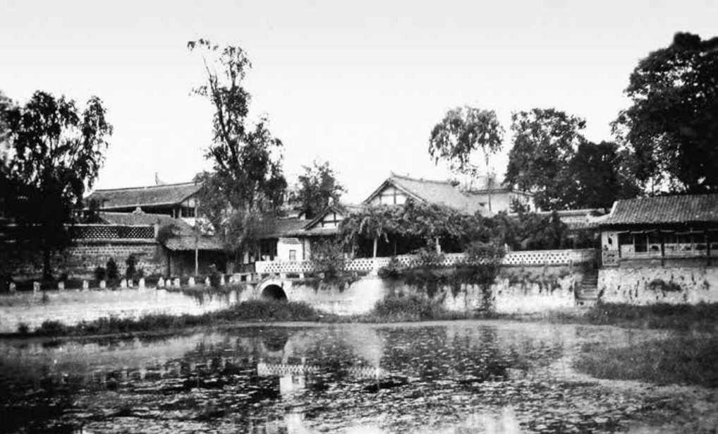 1913年后拆除少城,公园也渐荒芜。1914年,四川都督府委派内务司司长尹仲锡扩建公园,引金水河水经园内流向东边半边桥,凿渠之土堆成至今犹存的假山,遍栽林木,自此湖光山色成为公园盛景,假山之西凿荷花池,池中有座慈眉善目的观音大士持瓶喷“甘露”雕像;绕池植柳,树荫下有石桌凳售茶①。