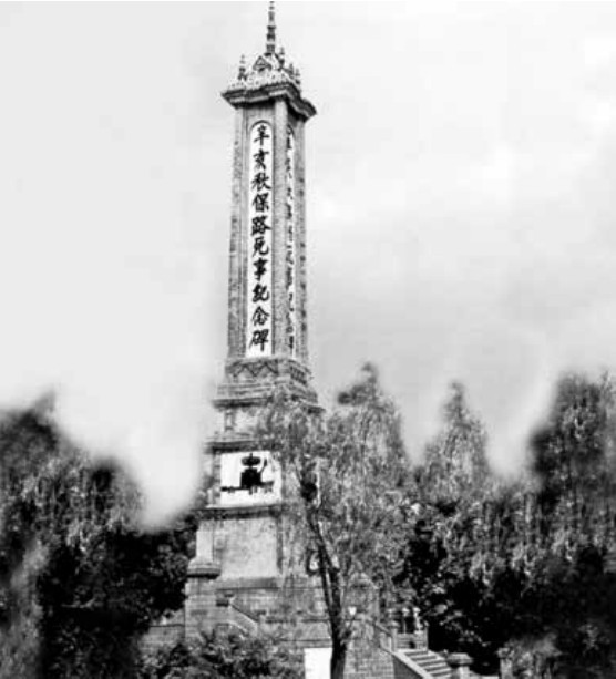 孙中山说过:“若没有四川保路同志会的起义,武昌革命或者要迟一年半载!”1914年成都的一件大事,是在公园内修建起一座巨碑,气势巍峨直指蓝天白云。此碑由留日归国的“双流大铁路公司”股东代表王楠等人设计,胡炳森监工。碑高31.68米,碑座四壁是火车机车和路轨浮雕。碑身四方形,四面均嵌有“辛亥秋保路死事纪念碑”的阴刻碑文,字径大近1米,由清翰林赵熙及川中名流颜楷、吴之英、张夔阶分别以真、隶、篆等不同字体书写,堪称碑中一绝。纪念碑风格中西合璧、典雅宏伟,毫无疑问地成为成都近代标志性建筑(现为国家级重点文物保护单位)……⑨
