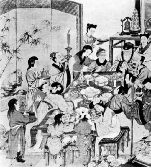 古时一家四代人除夕夜守岁时其乐融融的幸福情景(出自:清《新年夜宴图》)