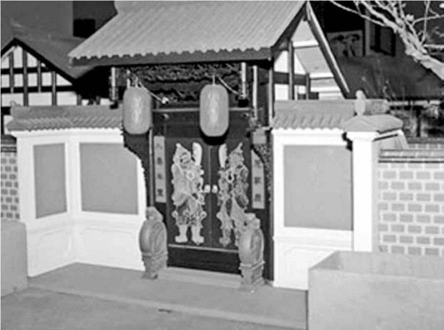 “几家灯烛辉煌的店铺夹杂在黑漆大门的公馆中间,点缀了这条寂寞的街道……有着黑漆大门的公馆静寂地并排立在寒风里。两个永远沉默的石狮子蹲在门口……每个公馆都经过了相当长的年代,或是更换了几个姓……这所公馆屋檐下也挂着一对大的红纸灯笼,只是门前台阶下多一对长方形大石缸,门墙上挂着一副木对联,红漆底子上现出八个隶书黑字:‘国恩家庆,人寿年丰’。两扇大门开在里面,门上各站了一位手执大刀的顶天立地的彩色门神……”从油亮的黑漆大门进去,是一堵白色照壁,四个土红色的篆字“长宜子孙”,嵌在照壁中央。公馆四进院落,几十间青瓦小房,还有花园、竹林……