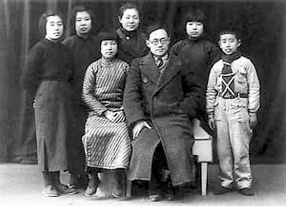 1941年,巴金回成都时与妹妹及侄女、侄儿们合影(中为巴金,右一为李致)