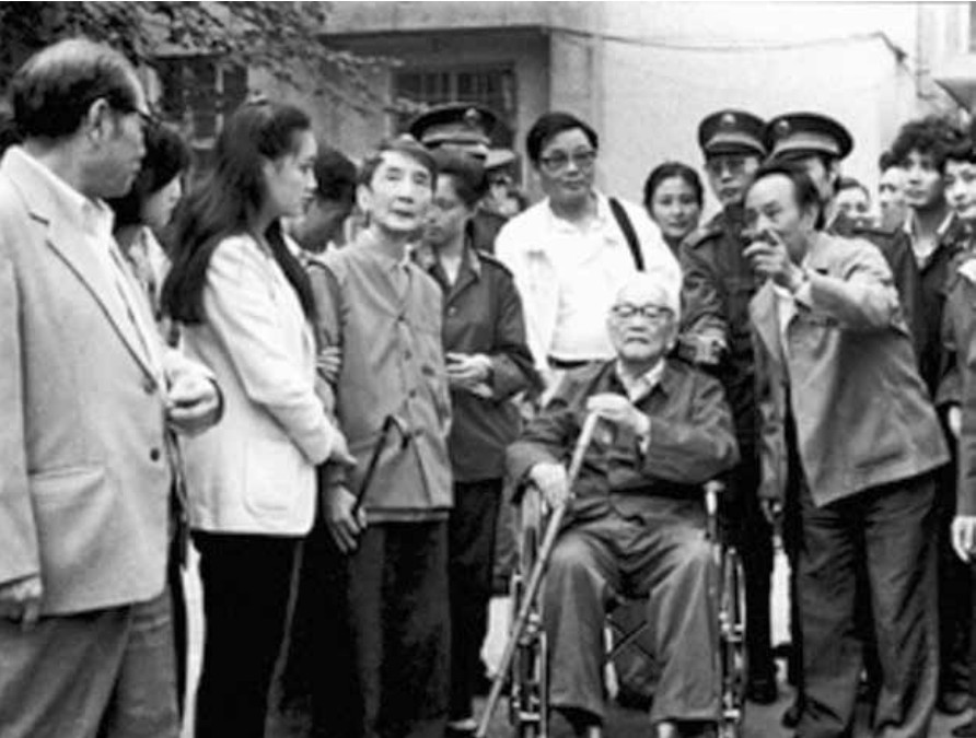 1987年10月7日,巴金在成都访问故居,听取曾任成都军区战旗歌舞团副团长的张耀棠(前右一)解说故居变迁情况。前左一为马识途,前左三为沙汀(供图:张耀棠)