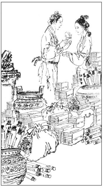 赵明诚按时回来了,不过他却让李清照一见面便大吃了一惊。只见赵明诚与往常一样,怀里抱着一大包东西,可是身上的长衫却没有了,只穿着一件内衣。李清照正待要问丈夫发生了什么事情,赵明诚已把抱回的东西摊在方桌上,乐呵呵地讲了起来。原来,今天他在大相国寺一个出摊的老头那儿发现了一幅米芾写的条幅,那可是一件极为难得的宝物啊。一打听价钱,他傻眼了,身上带的钱远远不够。那老头偏偏又不肯还价,弄得赵明诚走又舍不得,买又买不下。他本想回家取钱再回来买,又一想,这等难得之物,说不准在自己离开时会被别的识家买走,那自己岂不会后悔死了?情急之中,他一下子脱下了身上的长衫,作价卖给了那老头,然后又搭上一些钱,把那副米芾真迹买下了。还剩下的几个钱,照例给李清照买了食品。