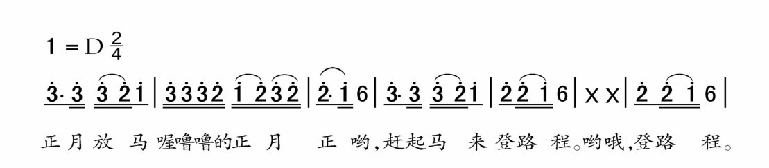 《放马山歌》的歌词简单,七言两句为一段,曲调活跃欢快,反映了牧童的日常生活情景。 从结构上来看,《放马山歌》也属于简洁型,包括上、下两个乐句,下乐句的曲调由上乐句的音乐素材发展而成,手法简练。 歌词中有“喔噜噜的”衬腔,也有“哟哦”等赶牲口的吆喝声,给人一种质朴的乡土气息。