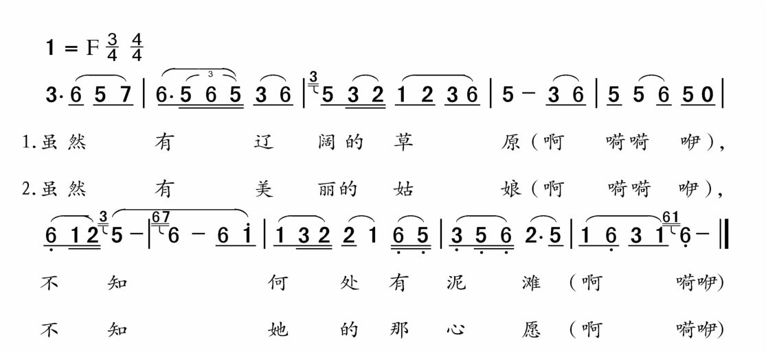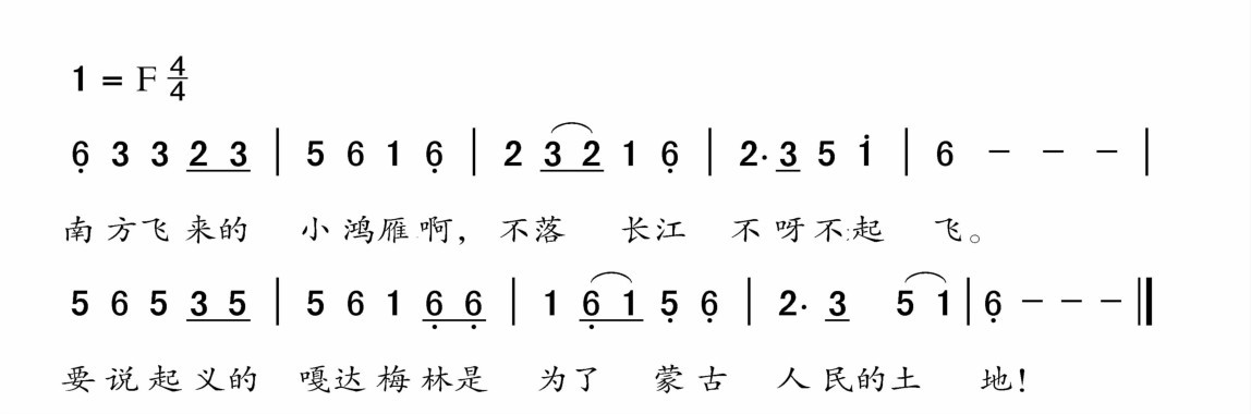 《嘎达梅林》包括两个大乐句。 第一乐句分两个句逗,旋律呈上行之势,最后在高八度的主音“La”上结束,给人以挺拔有力之感;第二乐句由高至低,一气呵成。 两个乐句的旋律线呈山峰形。