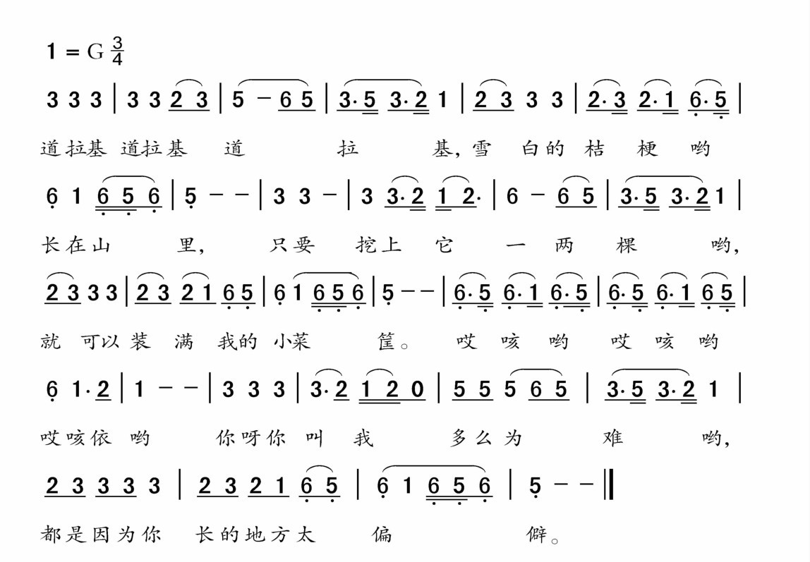 《道拉基》又名《桔梗谣》。 桔梗是朝鲜族人民非常喜欢吃的一种野菜。 每年春天,朝鲜族妇女结伴上山挖桔梗,这首歌也表达了她们外出时的愉快心情。