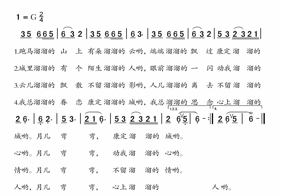 歌曲的旋律流畅真挚,优美动人。 每个乐段包括三个乐句。 前两个乐句主要在中、高音区,表现高昂热烈的情绪,第三乐句是第二乐句的变化重复,从低音区起腔,表现真挚委婉的感情。 歌词每段两句,中间加用了“溜溜的”“月儿弯弯”等衬词,使得节奏更为活跃,歌腔更为舒展,歌曲变得更为风趣生动。