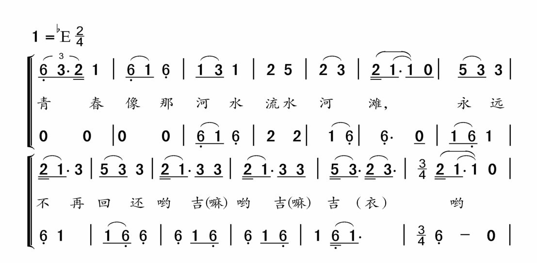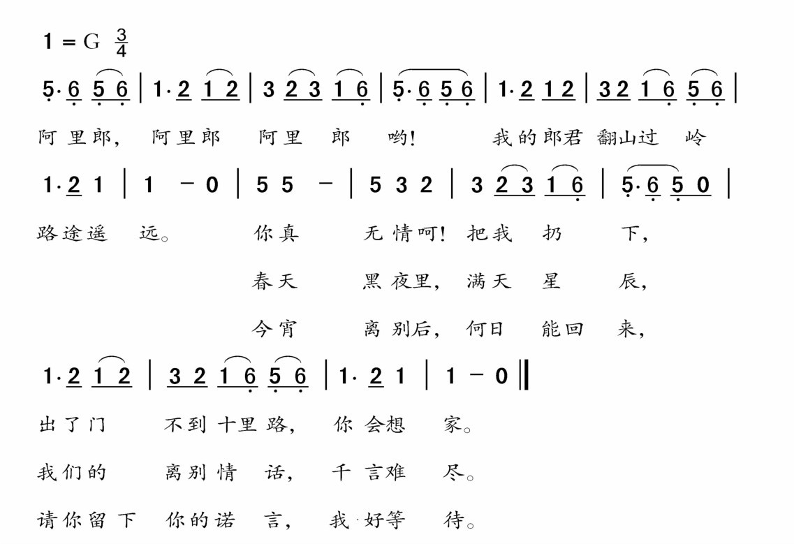 《阿里郎》表现了情人之间的爱恋感情,在朝鲜族人民中广泛流传。 《阿里郎》有多种形式,曲调虽然不一样,但一般都是抒发恋人间离别的痛苦以及对美好生活的向往和期待。 《阿里郎》乐曲采用的是四个乐句构成的带副歌的分节歌形式,属于典型的“起、承、转、合”结构。 其第一、二句是对称的上下句结构,第三句有所对比,第四句一般重复或变化重复第二句。