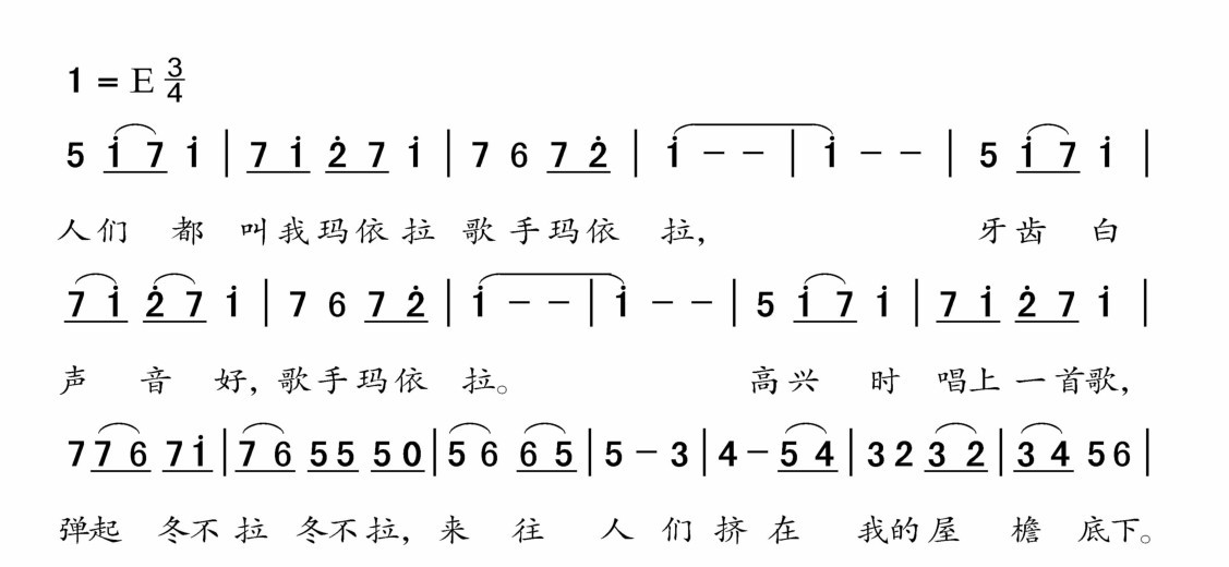 《玛依拉》在运用音调材料方面做到了精练简洁。 其歌曲可以分成前后两个部分。 前面的一部分包括两个乐句,第一乐句(1—5小节)是整首歌曲音调的核心;第二个乐句(6—10小节)是它的原样重复,主要起巩固核心的作用。歌曲前面的这一部分奠定了主题陈述的基础。 歌曲的后面部分(11—30小节)是指之后的20小节,主要运用重复、扩展、紧缩等手法,不断变化主题材料。 当然,后面这一部分也可以分为两个分段:11—20小节属于正词段,21—30小节是衬词段。 但不管分成多少段,从素材使用方面来看,全首《玛依拉》仍然表现出高度的统一性:后面一部分的第一分段、第二分段都是由前面一部分派生出来的。 因此,它们既高度统一,又富于变化,既互相呼应,又相互对比,突出体现了哈萨克族人民在音乐创作方面的高超技艺。