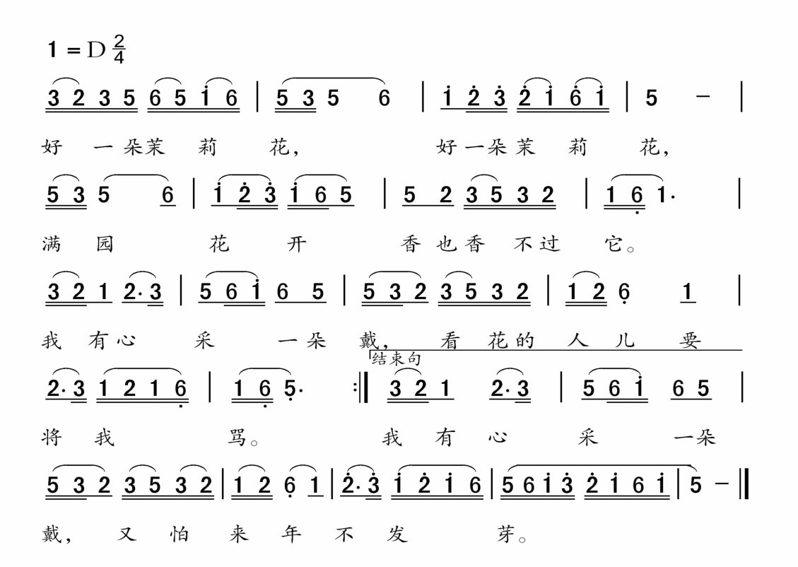 民间小调《茉莉花》深受人们喜爱,在全国各地广为传唱。 《茉莉花》主要表现一位天真可爱的姑娘想摘茉莉花却又怕受到责骂的心理,反映了青年男女之间纯洁美丽的爱情。 《茉莉花》在每个地区的版本都不太一样,只是歌词基本相同,但风格色彩因流传地域、语音不同而有所差异,这充分体现了民歌的变异性。 北方地区《茉莉花》的内容与南方地区相差不大,旋律多跳进,给人刚直和干脆之感,体现了北方人爽朗、刚直、明快的性格,但其节奏远不如南方地区特别是现在听得较多的江苏《茉莉花》匀称细致。