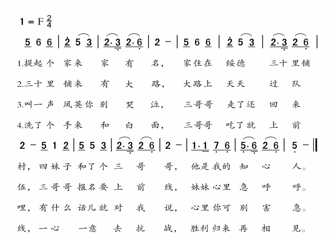 歌中的“四妹子”凤英,是一个思想进步、敢于斗争的农村姑娘,她不畏世俗,冲破重重束缚与阻挠,和“三哥哥”邱双喜相爱。 “三哥哥”参军离家时,“四妹子”怀着依依不舍的心情为他送行。