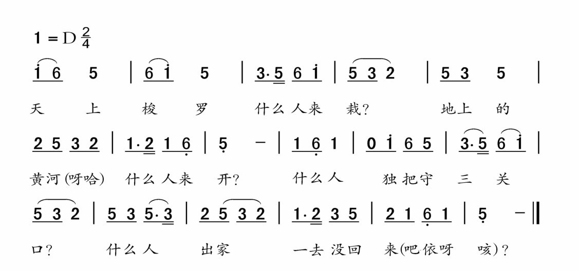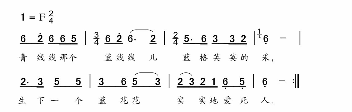 《蓝花花》近乎完美地将叙述性和抒情性结合,饱含着高原式的抒情格调,以信天游体描写一个年轻女子一生的悲惨经历。 陕北信天游所抒发的感情带有浓郁的黄土高原情调,这种情调高亢中带有深沉、苍凉、忧郁的情绪,充分反映了生活在艰难贫困中的当地农民的心理特征。 歌曲的结构是上、下两个乐句构成的一段式,曲调运用四五度音程跳进,节奏自由,旋律优美流畅。 歌曲的第一乐句就是全曲的高音区,表达了演唱者深深的感叹甚至愤慨,仿若长期被压迫的人民从生活的底层猛然迸发出来的一声呐喊,悠悠地回响在高原的旷野上。 第一乐句像整首歌曲感情的发射中心,后面的乐句好像都是由它发射而出。 这样的结构使得《蓝花花》的曲调统一完整,顺畅自然,将听众带到故事所发生的那个黄土高原上。