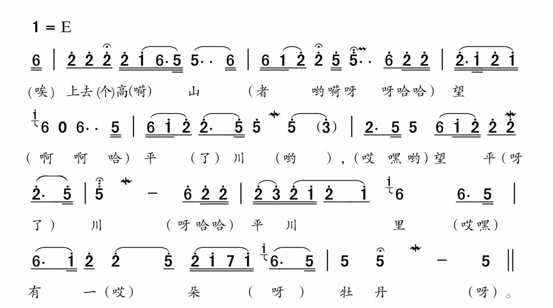 《上去高山望平川》也称河州大令,是流传最广、最典型的大调子曲调山歌花儿之一。 歌曲的前两句歌词主要写景,后两句点题,词意含蓄,颇具哲理。《上去高山望平川》以小伙子的口吻唱出,主人公把自己心爱的姑娘比喻成牡丹,表达了演唱者向往爱慕姑娘却又难以接近她的矛盾心情。 歌曲曲调由高至低,再由低至高,回环往复,优美动听。