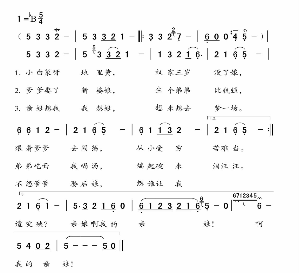 《小白菜》是一首在河北和北方其他部分地区流传极广、家喻户晓的优秀传统儿歌。 歌曲通过简单却极为生动感人的歌词,运用级进下行带有哭泣性质的音调,使用逐层下旋的旋律发展手法,深切真实地表现了一个失去亲生母亲而受继母虐待、孤苦无依、可怜凄惨的小女孩悲伤痛苦的心情。 歌曲曲尾的两个短衬是可怜小女孩的自哀自叹,目的在于进一步烘托全曲的悲切气氛。 歌剧《白毛女》中著名的主题歌《北风吹》就是以《小白菜》为素材改编而成的。