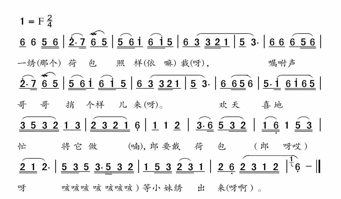 小调《绣荷包》在全国各地流行,但各地的曲调并不一样,其中以山西的《绣荷包》最为人们所熟悉喜爱。 《绣荷包》真实地描写了青年男女的爱情生活,表现了一个少女思念恋人并亲自绣荷包准备送给恋人时的内心活动。 歌曲包括两个乐句,旋律明快,起伏有致,极具抒情性。 四川《绣荷包》的曲调密切结合四川方言,音乐极具地方特色。 歌曲上下乐句的音乐结构在一定程度上还保留着当地山歌的痕迹。 山东《绣荷包》运用抒情的羽调式,是由四个不规整的“起、承、转、合”乐句组成的单乐段结构形式:第一、二乐句是完全重复的“起承”关系,句尾的拖腔较长;第三乐句与前两个乐句在结构和情绪上是“转”的关系,句尾拖腔较短,曲调也相应发生了变化,结构排列较为紧凑密集,情绪高昂,表达了一种喜悦欢快的心情;第四乐句与前面三个乐句之间是“合”的关系,起点题作用,总结前三个乐句,曲调结构有所扩充,结束句的语气有所加强,细腻逼真地表现了少女内心丰富的心理活动。 下面的乐谱即为山东《绣荷包》片断。