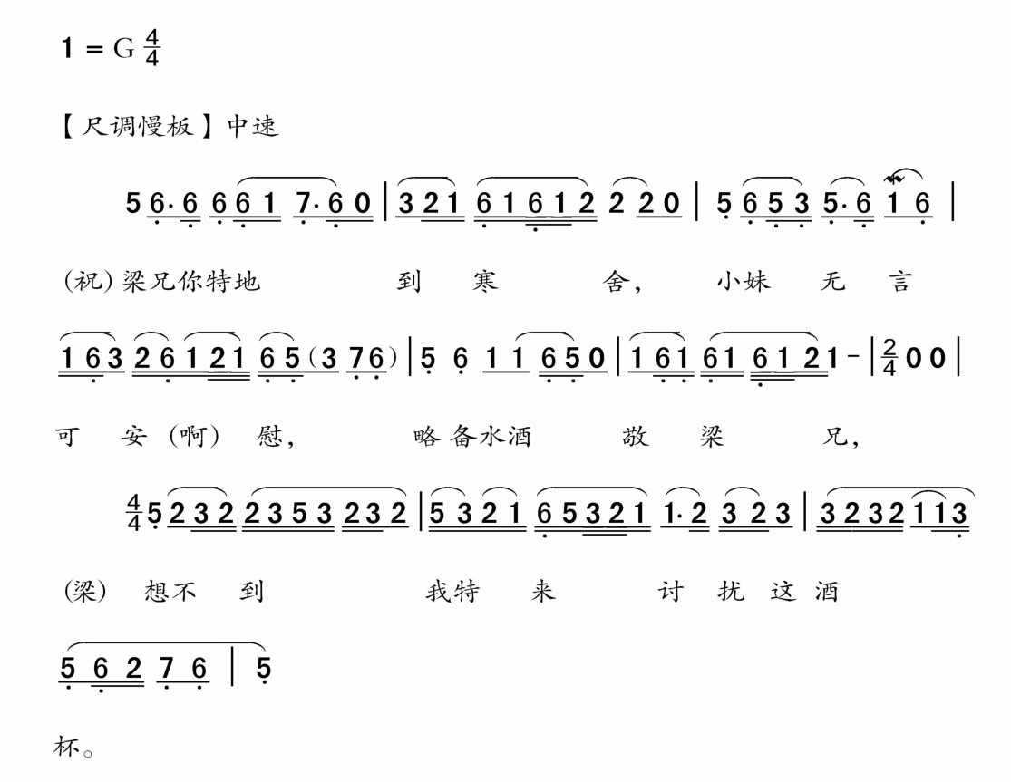 下面的唱段选自越剧《梁山伯与祝英台》中《楼台会》一折,表现了梁祝二人在楼台相叙,见姻缘无望而不胜悲愤的情绪。 其唱腔哀婉悲切,异常动人。特别是祝英台唱的慢板,在低音区缓慢展开旋律,音调柔和而深沉,委婉细腻地表达了祝英台的哀伤、忧愁以及对梁山伯真挚忠贞的爱情。