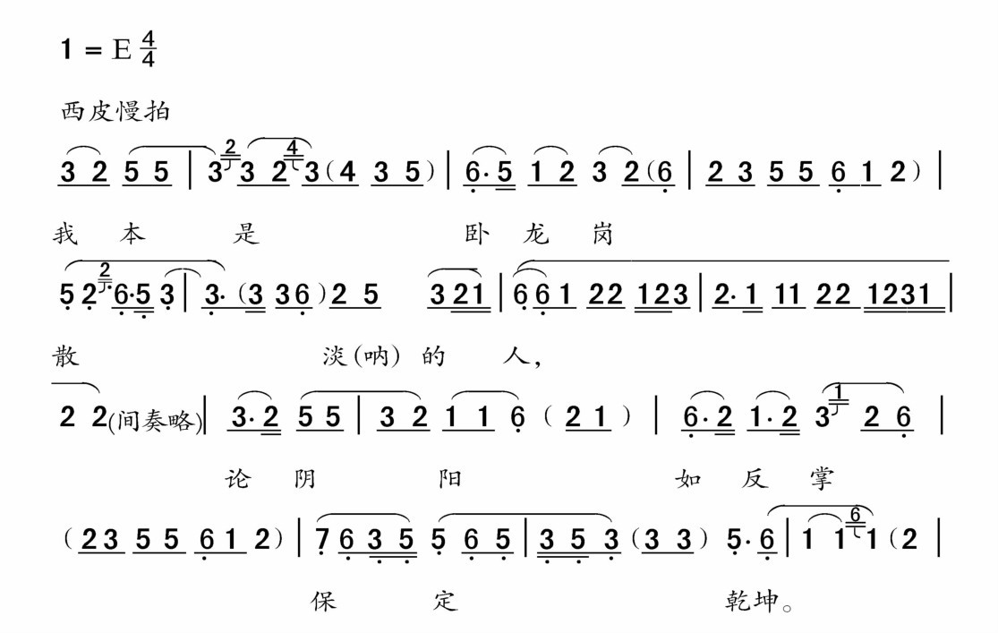 《空城计》中《我本是卧龙岗散淡的人》唱段是西皮慢板成套唱腔,宫调式,眼起板落,跳跃多,速度较缓,唱腔中使用了长拖腔,充分表现了诸葛亮胸有成竹、悠闲洒脱地等待司马懿的心情。