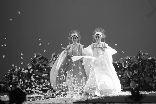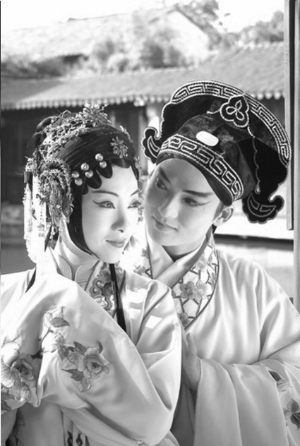 《梁山伯与祝英台》是著名的越剧传统剧目,其大致背景为:祝英台女扮男装在外求学,与梁山伯同窗三载,日久生情。 祝英台归家之前向师母吐露真情。 梁山伯得知后赶往祝家,但祝父早已将祝英台许配给他人。 梁山伯无奈归家,最终积郁成疾而病故。 祝英台在迎娶之日纵身扑入梁山伯之坟,之后二人双双化蝶而飞。 《梁山伯与祝英台》通过“草桥结拜”“三载同窗”“十八相送”“楼台会”四段,生动地刻画了两位主人公忠贞、曲折、凄美的爱情故事。