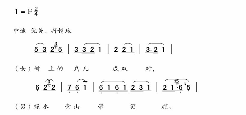 黄梅戏《天仙配》选段《树上的鸟儿成双对》的故事背景是:玉帝的七仙女在天宫看到人间的董永卖身葬父后,在同情爱怜之余,不顾天规威严,来到凡间和董永结为夫妻。 随后,二人同去傅员外家做工。 百日期满,夫妻欣然归家,在归家途中唱起了这一唱段《树上的鸟儿成双对》。 《树上的鸟儿成双对》运用彩腔,多段唱词用分节歌方式,开始是二人对唱,后来又在这一音调的基础上发展成男女声二重唱。 在欢悦跳跃的弦乐伴奏下,舒展的旋律和浓郁的韵味,表现了二人内心的喜悦。 不少歌唱家都曾在音乐会上演过这个唱段,受到广大听众的欢迎。 黄梅戏表演艺术家严凤英扮演七仙女表演此唱段时,发声自然,音色优美,行腔流畅,韵味隽永,广受人们喜爱。 黄梅戏表演艺术家王少舫扮演董永演唱此唱段时,感情真挚,韵味浓厚,对黄梅戏的男声唱腔也有一定创造。