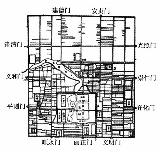 (1)城市结构简单,城市职能单一。 早期城市一般都是行政、宗教、军事或手工业和商业的中心。 城市的结构和形态都比较单纯。 城市多以王宫、庙宇、教堂、官邸以及其他大型公共建筑为中心。 两河流域的巴比伦(图1-1)、古希腊的雅典(图1-2)、法国的巴黎、中国隋唐的长安城(图1-3)和元代大都城(图1-4)都基本如此。 这都反映了城市生产力水平不高,城市功能比较单纯的状况。