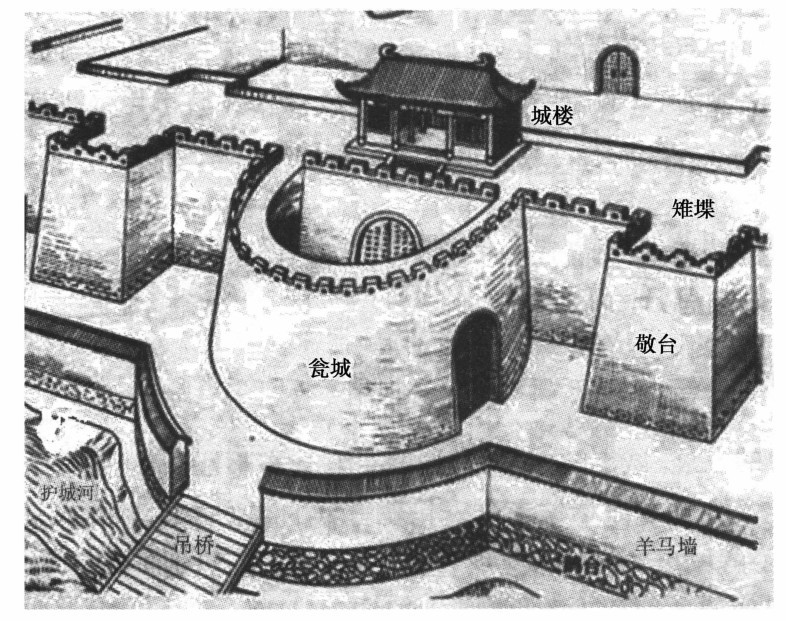 (3)军事职能占主要地位。 初期的城市都有很强的防御要求,最初是防止野兽袭击,后来则是由于战争的需要。 古代战争频繁,城市多筑于山上,筑有几重城墙,城墙外还有深而广的城壕(图1-5)。