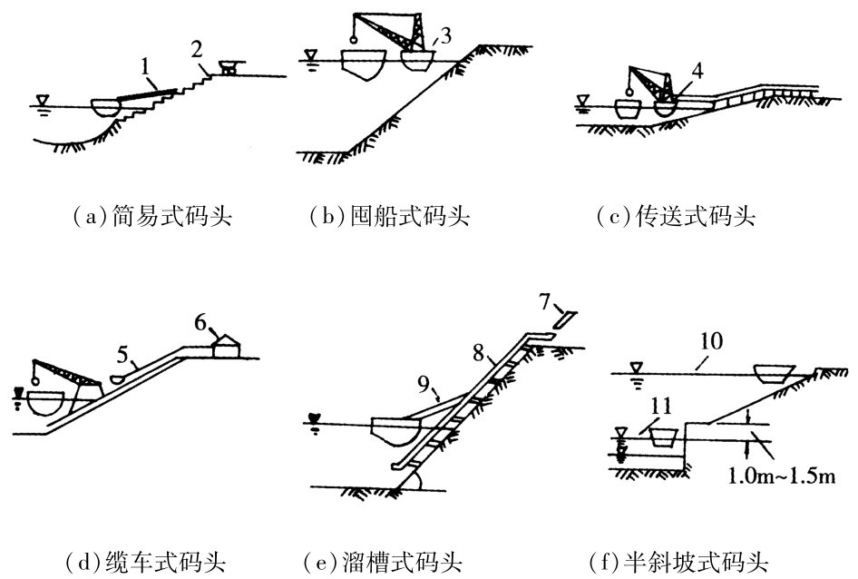 1-跳板;2-踏步;3-囤船;4-传送带;5-缆车;6-绞车房;7-溜斗;8-固定溜槽;9-活动溜槽;10-高水位;11-低水位