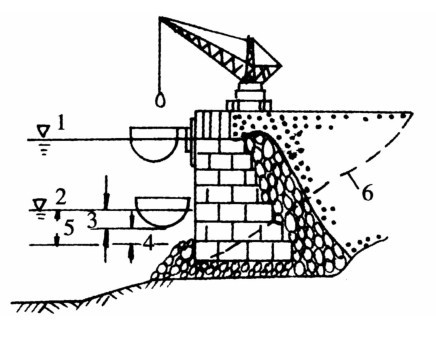 图3-10所示为一种直立式重力式结构码头型式。 它的特点是便于配备各种型式起重设备,以提高码头机械化程度,船舶停靠及装卸作业方便。 但造价高,施工期长,低水位作业时控制起吊不便。 它适用于码头面至设计低水位的高差在12m以下,河床稳定岸坡较陡且有条件采用起重机构的货运码头。 此外,还有突堤式码头,其特点是能停泊较多的船舶,占用岸线长度较少,但造价高。适用于江面较宽的大型码头,还有建造更简便的浮码头,适用于水位变化小于5~6m的情况,沿岸靠船墩,适用于输送液体的码头。