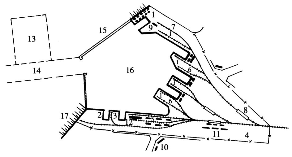 1-码头;2-工作船码头及航修站;3-维修基地;4-港界;5-港口仓库;6-露天货场;7-铁路装卸线;8-铁路分区调车场;9-作业区办公室;10-港口管理局;11-储存仓库;12-客运站;13-港外锚地;14-进港航道;15-防波堤;16-港内航道;17-护堤