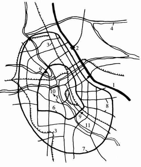 1-高速公路;2-立交桥;3-铁路;4-河流;5-内环线;6-中环线;7-外环线;8-射线;9-副中心;10-劝业场;11-海河