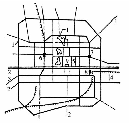前述我国城市道路一般分为主干道、次干道与支路。 但城市规模、性质不同,道路分类也不尽相同。 特大城市、大城市道路功能分得较细,类别等级也较复杂。 大城市归纳划分为六类,即快速交通干道(要求设计行车速度在60~80km/h之间,与同级道路相交需采用立交),主要交通干道和一般交通干道(要求设计行车速度为60km/h和40km/h),以上交通干道的两侧,均不宜布置能吸引大量人流的大型商业、文化娱乐设施。 还有就是区干道、支路及专用性道路(即独立的自行车道、步行街道等)。 对商业大街规划时应限制货运车辆通行,如图4-1中的5即王府井大街等。