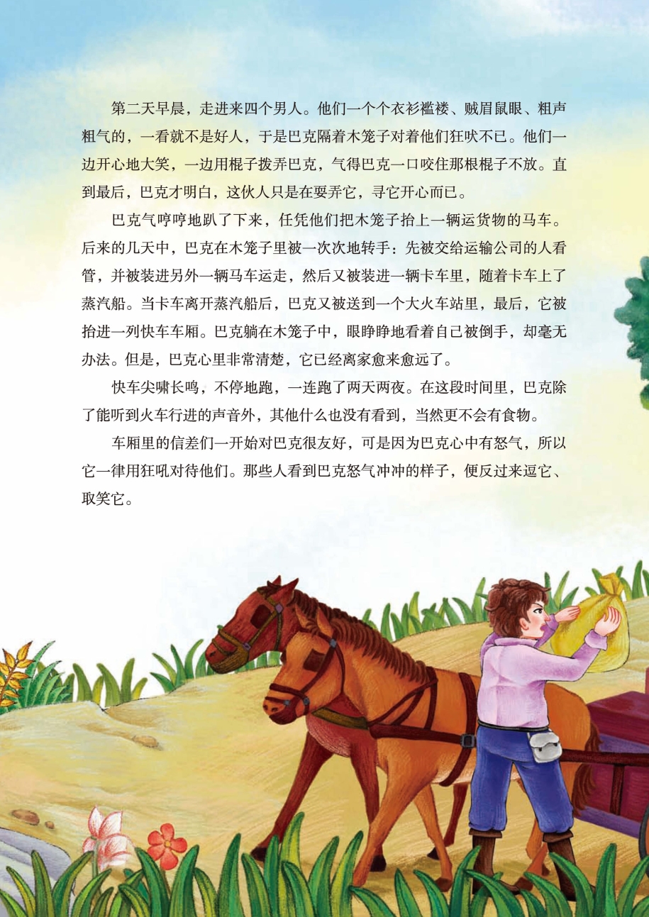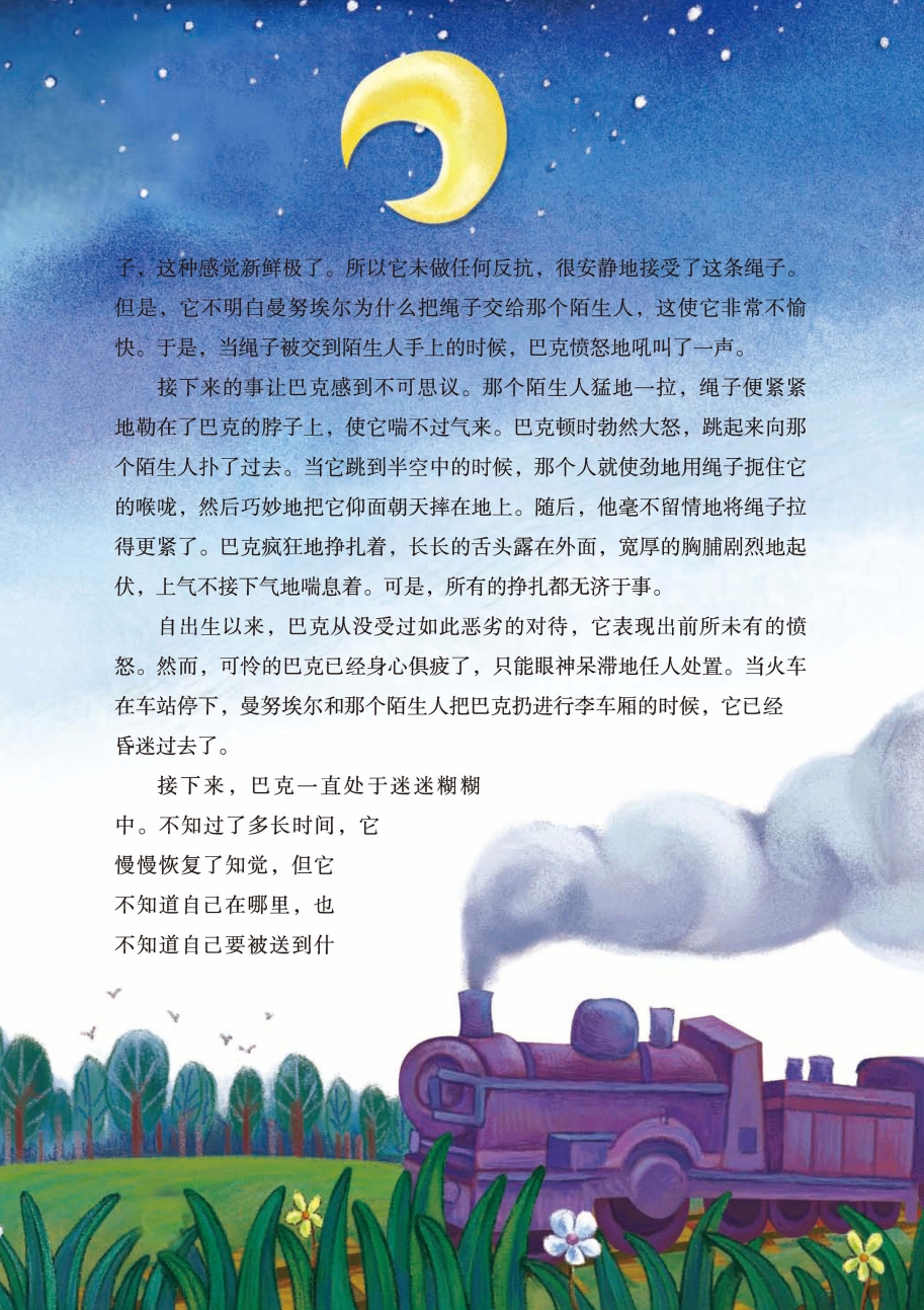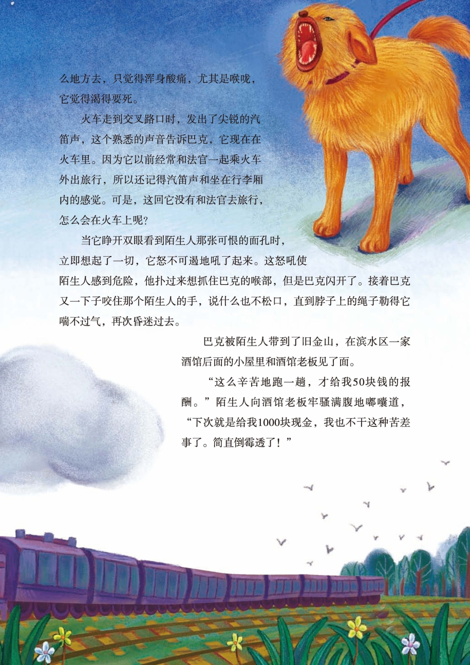 火车走到交叉路口时,发出了尖锐的汽笛声,这个熟悉的声音告诉巴克,它现在在火车里。因为它以前经常和法官一起乘火车外出旅行,所以还记得汽笛声和坐在行李厢内的感觉。可是,这回它没有和法官去旅行,怎么会在火车上呢?