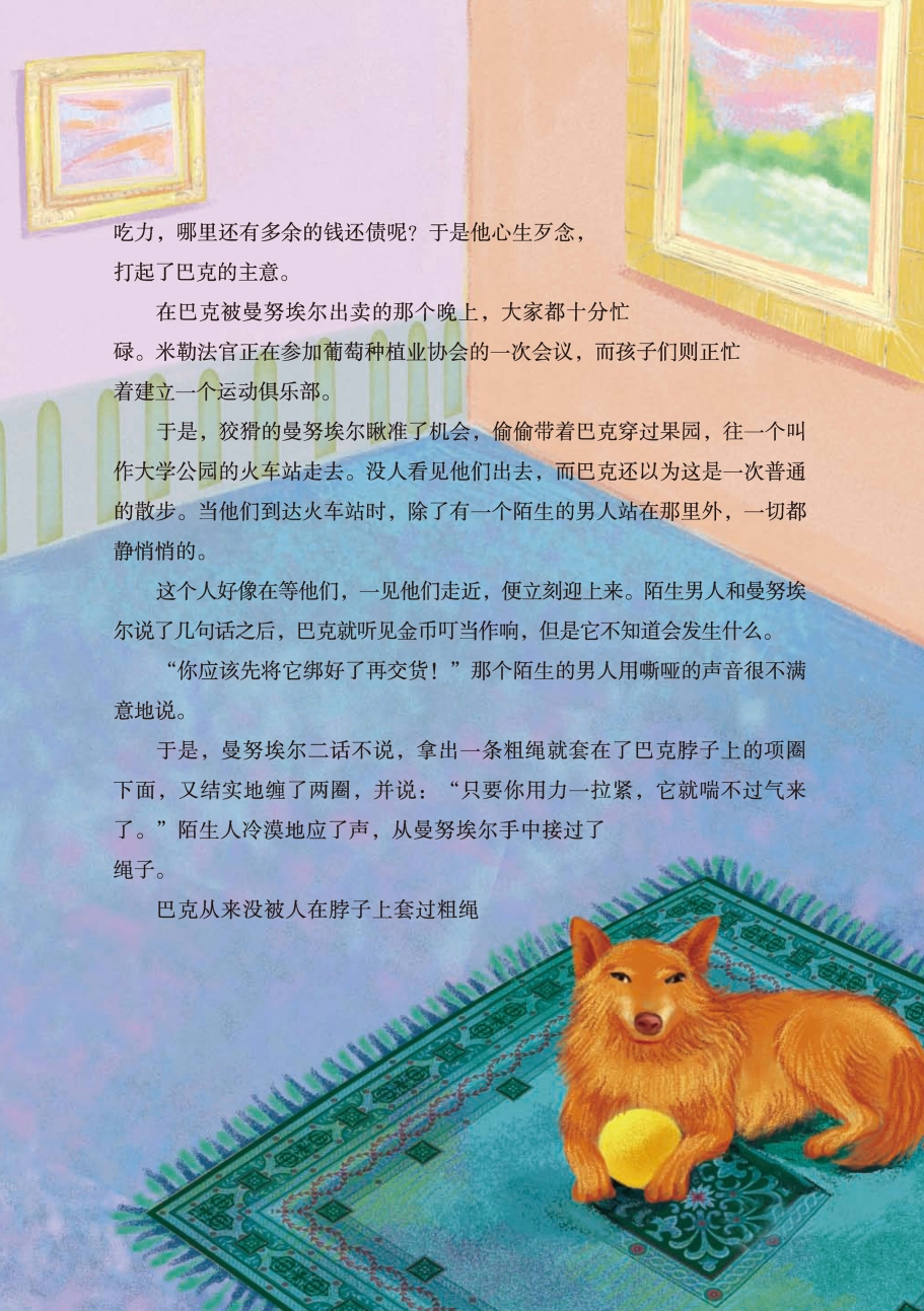 不过,有一件事让巴克很高兴:原来系在它脖子上的粗绳已经被解开了。于是,巴克决定给折磨自己的人一点儿颜色瞧瞧,并且下定决心,绝对不让他们再把绳子系在自己的脖子上。