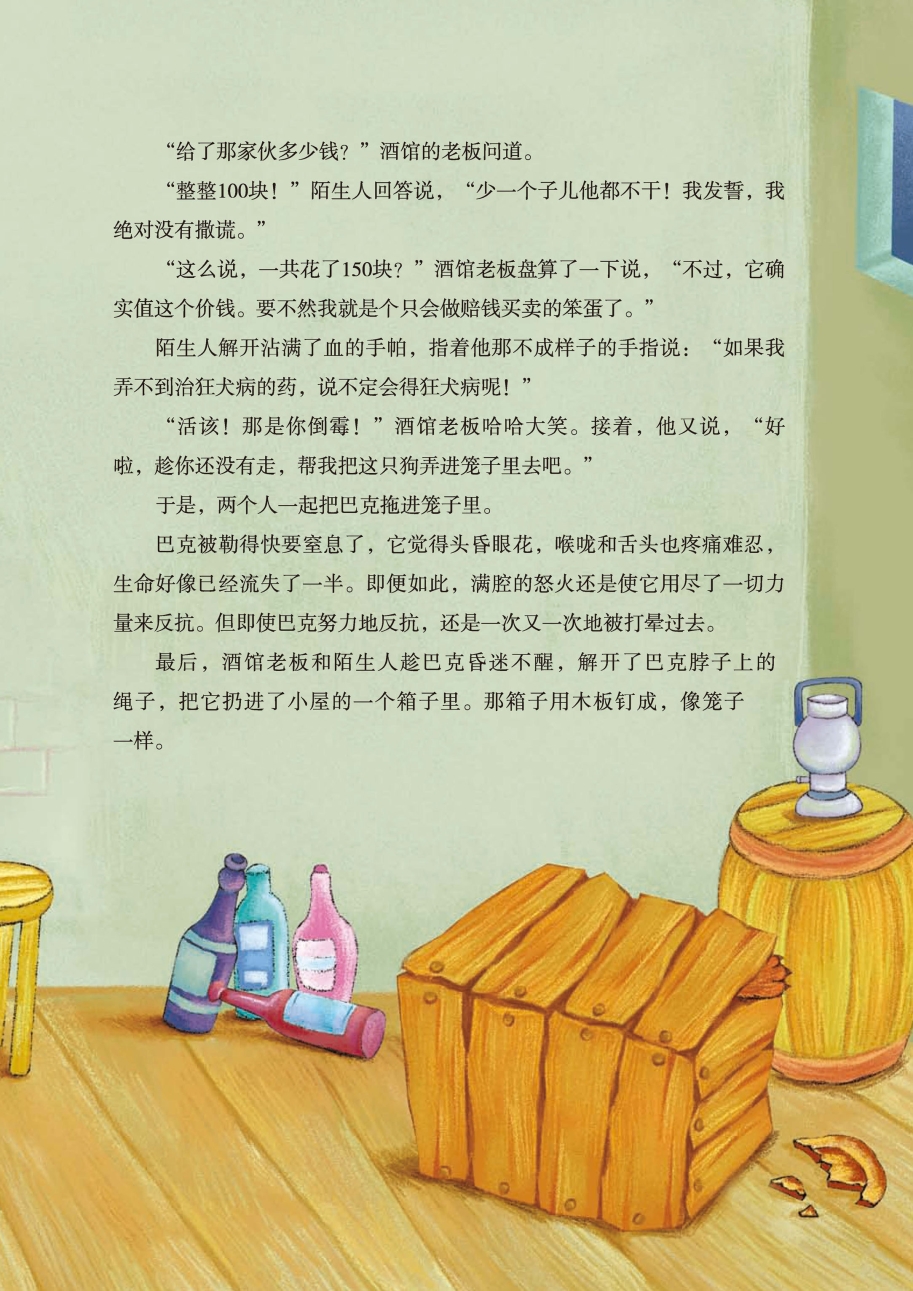 最后,酒馆老板和陌生人趁巴克昏迷不醒,解开了巴克脖子上的绳子,把它扔进了小屋的一个箱子里。那箱子用木板钉成,像笼子一样。