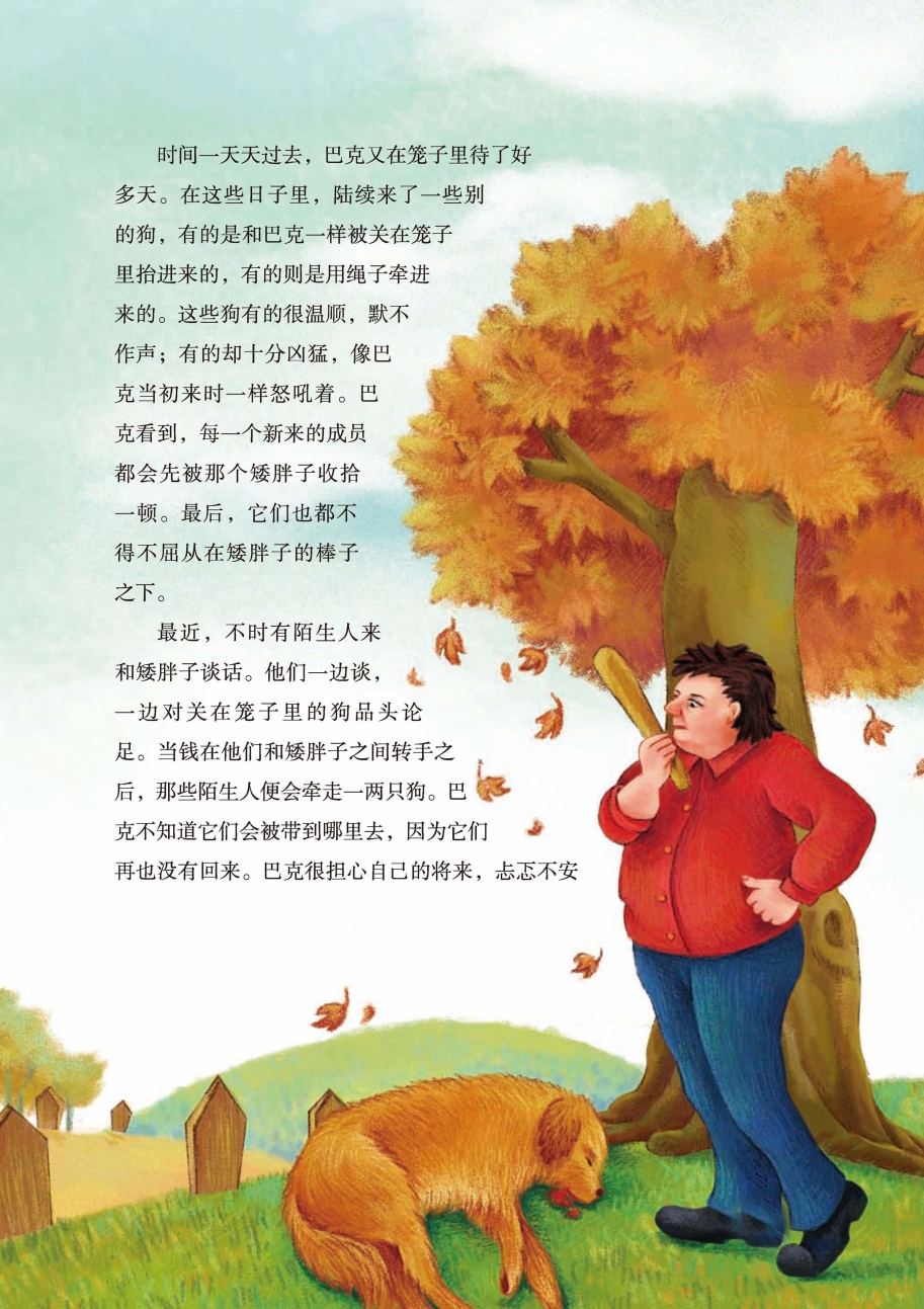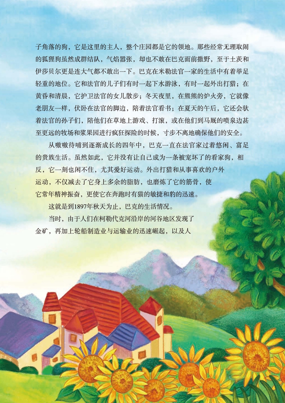 巴克可不是那种只能挤在狗窝或待在屋子角落的狗,它是这里的主人,整个庄园都是它的领地。那些经常无理取闹的狐狸狗虽然成群结队,气焰嚣张,却也不敢在巴克面前撒野,至于土茨和伊莎贝尔更是连大气都不敢出一下。巴克在米勒法官一家的生活中有着举足轻重的地位。它和法官的儿子们有时一起下水游泳,有时一起外出打猎;在黄昏和清晨,它护卫法官的女儿散步;冬天夜里,在熊熊的炉火旁,它就像老朋友一样,伏卧在法官的脚边,陪着法官看书;在夏天的午后,它还会驮着法官的孙子们,陪他们在草地上游戏、打滚,或在他们到马厩的喷泉边甚至更远的牧场和浆果园进行疯狂探险的时候,寸步不离地确保他们的安全。