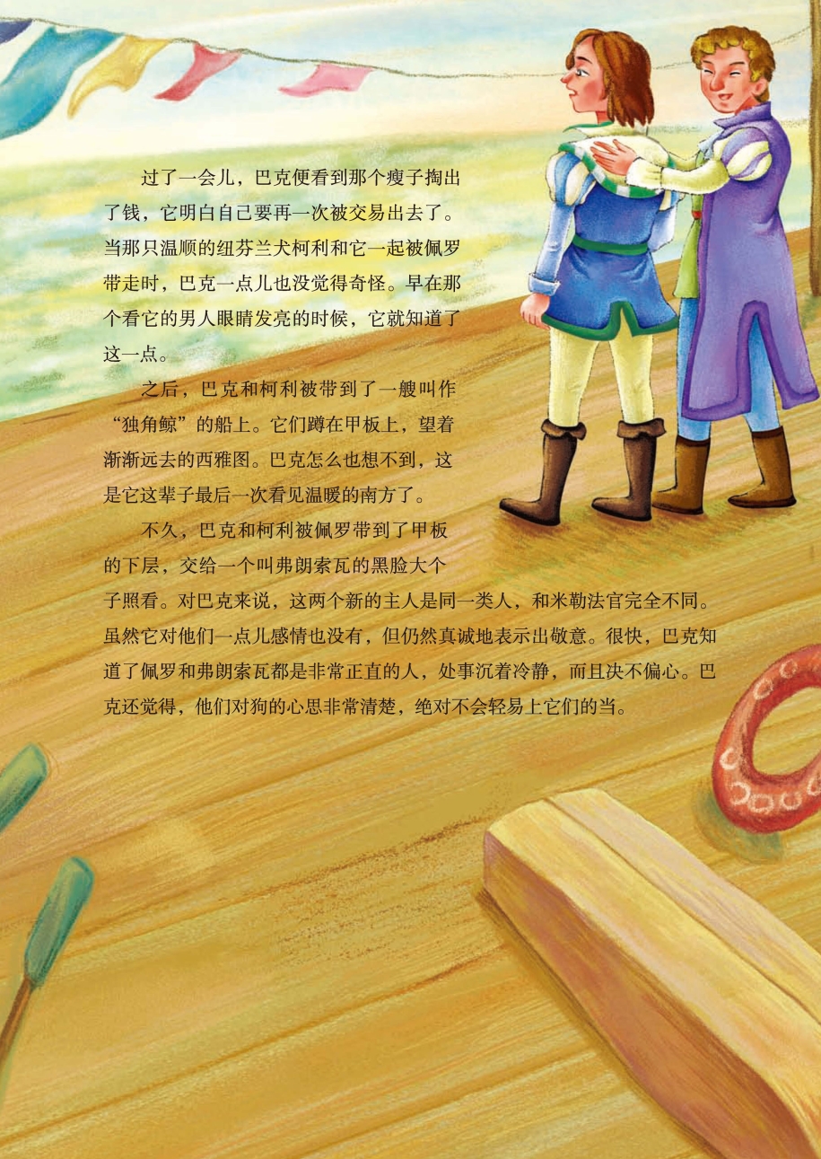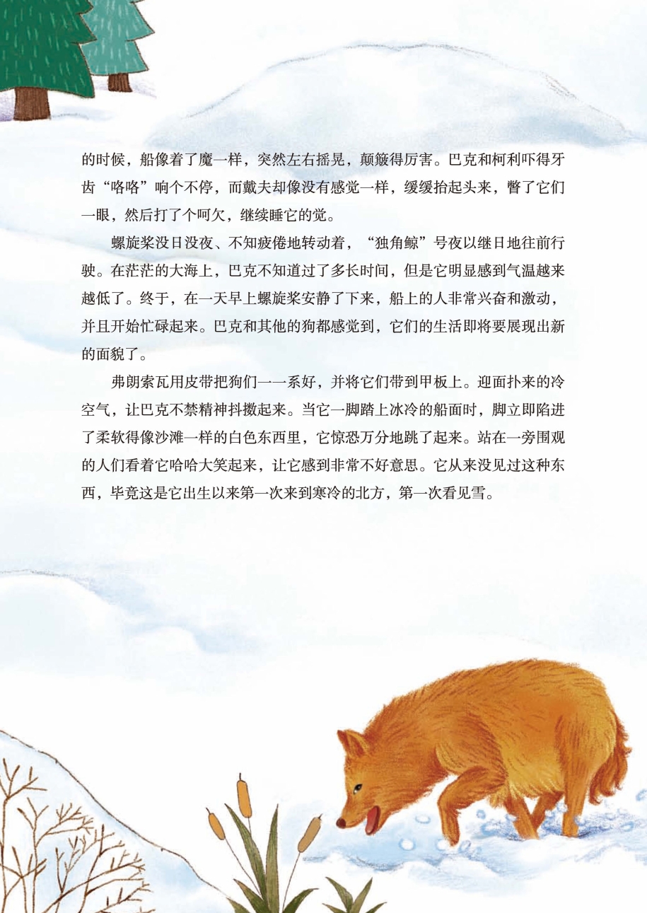 之后,巴克和柯利被带到了一艘叫作“独角鲸”的船上。它们蹲在甲板上,望着渐渐远去的西雅图。巴克怎么也想不到,这是它这辈子最后一次看见温暖的南方了。