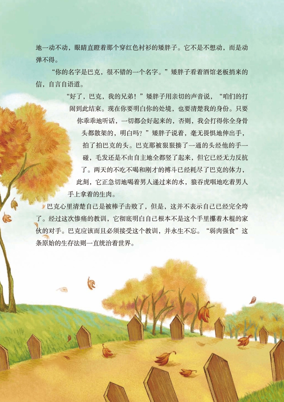“好了,巴克,我的兄弟!”矮胖子用亲切的声音说,“咱们的打闹到此结束。现在你要明白你的处境,也要清楚我的身份。只要你乖乖地听话,一切都会好起来的,否则,我会打得你全身骨头都散架的,明白吗?”矮胖子说着,毫无畏惧地伸出手,拍了拍巴克的头。巴克那被狠狠揍了一通的头经他的手一碰,毛发还是不由自主地全都竖了起来,但它已经无力反抗了。两天的不吃不喝和刚才的搏斗已经耗尽了巴克的体力,此刻,它正急切地喝着男人递过来的水,狼吞虎咽地吃着男人手上拿着的生肉。