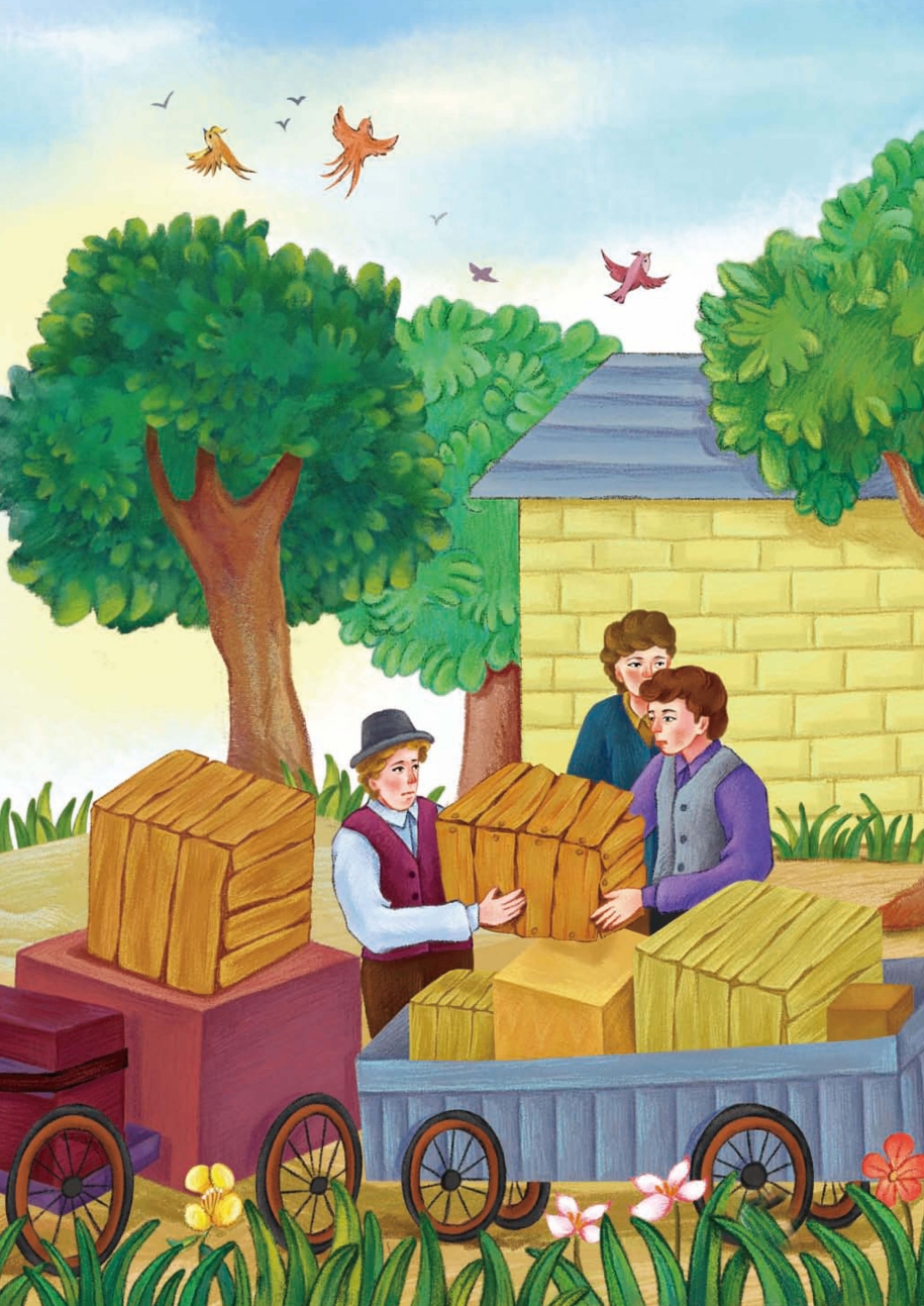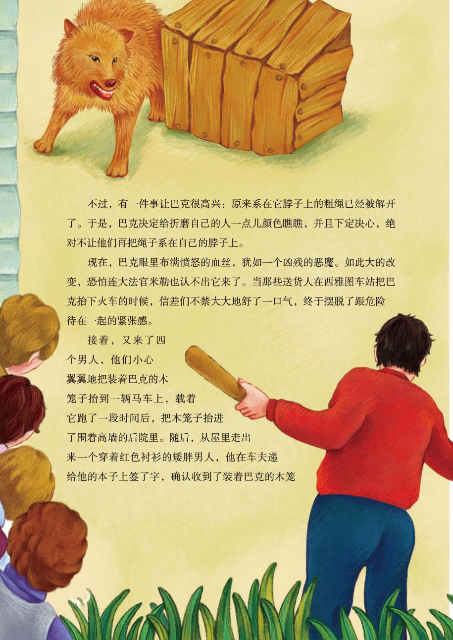 接着,又来了四个男人,他们小心翼翼地把装着巴克的木笼子抬到一辆马车上,载着它跑了一段时间后,把木笼子抬进了围着高墙的后院里。随后,从屋里走出来一个穿着红色衬衫的矮胖男人,他在车夫递给他的本子上签了字,确认收到了装着巴克的木笼子。他一面把本子递给车夫,一面望着巴克阴险地笑了一下,接着就从屋里拿出了一把小斧头和一根木棒。